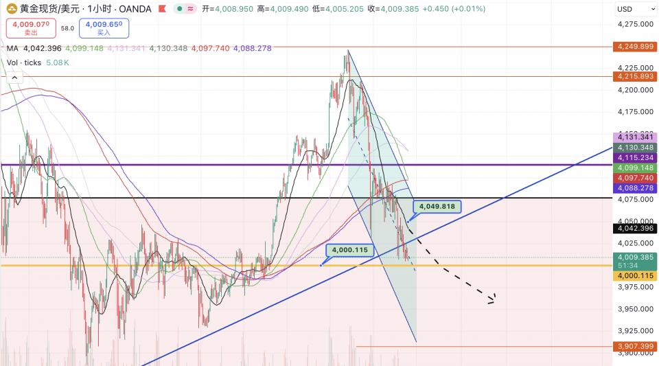 黄金自上周五跌下1小时20MA均线后,今天欧盘价钱曾短暂刺破该均线,但并没无形成冲破,美市尾盘价钱再次暴跌,至此跌势曾经成型。今天上午黄金也没有表示出几多,午前价钱最低触及4004美元/盎司,为11月10日来的新低。主要的是,本次下跌使得行情跌破了自本年8月下旬起头的上升趋向线,理论上来说,价钱可能不竭下行至50天均线。投资者应关心4030-4050区间的第二个卖出机遇。第一个机遇正在4000-3990美元区间,由于一旦金价跌破4000美元,跌势大要率会延续,下方方针看至3980附近。